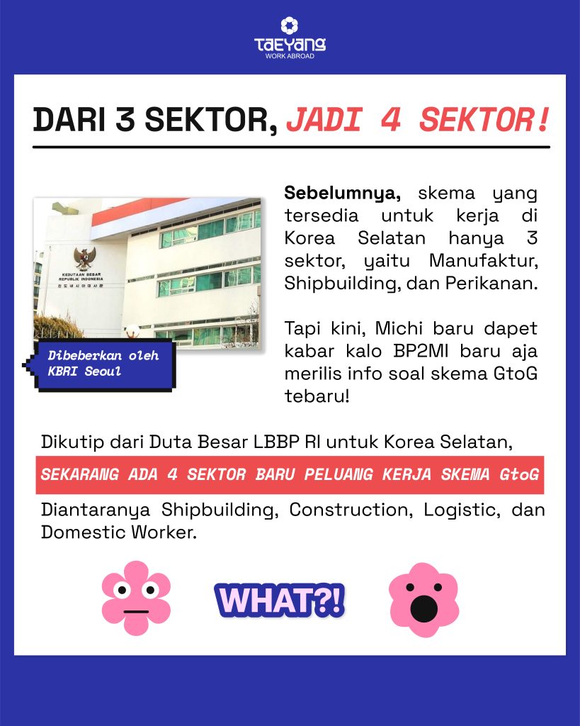 Tau kan, kalo GtoG memberi banyak pilihan pekerjaan menarik di Korea Selatan? GtoG sendiri adalah kesempatan yang disediakan bagi PMI melalui BP2MI. Program ini juga bekerja sama langsung antara pemerintah Indonesia dan negara tujuan, lho!