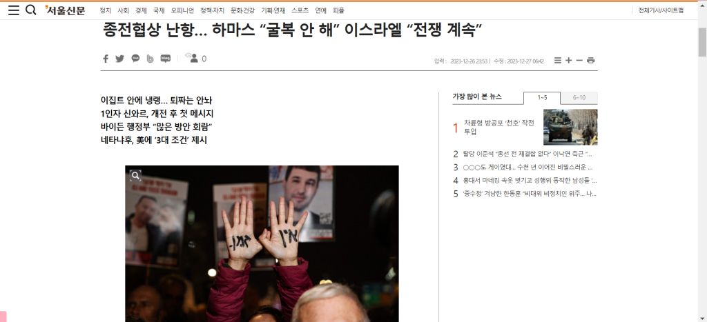- “종전협상 난항… 하마스 “굴복 안 해” 이스라엘 “전쟁 계속””