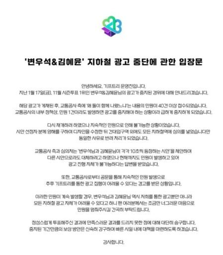 Giftree mencoba memperbaiki desain iklan dengan memisahkan penampilan Byeon Woo Seok dan Kim Hye Yoon secara individu, tapi tetap ditolak. Bahkan, ada saran untuk revisi desain lain, tapi semuanya gagal karena keluhan terus berdatangan. Padahal, tema voting ini jelas tentang pasangan drama, dan keduanya menang dengan dukungan suara fans. Netizen Korea pun gak habis pikir, “Bukannya ini hasil voting fans? Kenapa malah dipermasalahkan?”